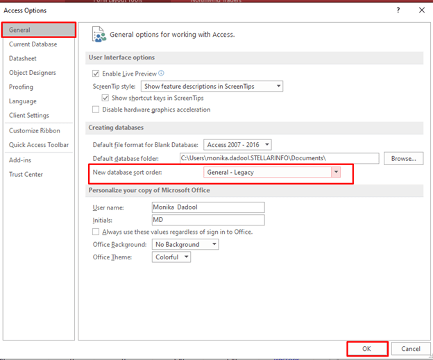 - Cambie la configuración de «Clasificación de la nueva base de datos» a General-Legacy.