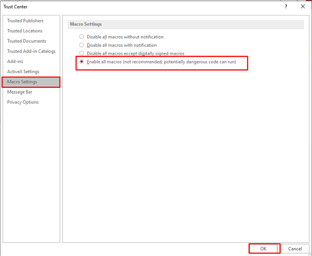 - Haga clic en Configuración de macros y compruebe si la opción «Activar todas las macros» está seleccionada en la lista. Si no es así, seleccione la opción y haga clic en
