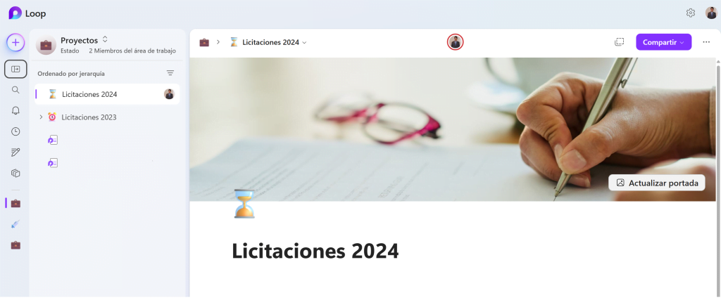 El otro cambio lo podemos observar al entrar en cualquier página. Para empezar Loop estrena nuevas animaciones a la hora de entrar en un área de trabajo. El área superior de la página nos muestra donde nos encontramos y un icono que representa el área de trabajo. Microsoft quiere facilitar la navegación y con estos pequeños detalles se mejora y facilita esta función.