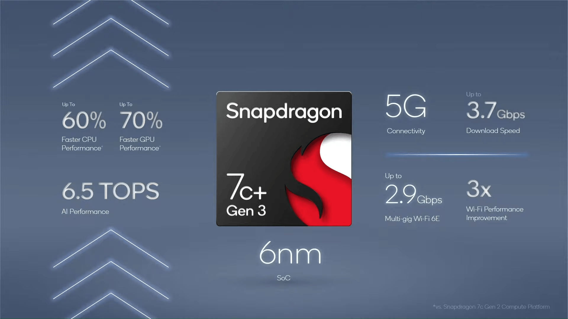 Bajo un proceso de 6 nanómetros, el Snapdragon 7c+ nos promete hasta un 60% más de velocidad en CPU y un 70% más de velocidad en velocidad de GPU. También nos prometen hasta 6.5 TOPS en cuando al rendimiento de la IA.