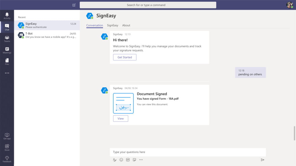 Una vez instalemos SignEasy en Microsoft Teams, la pestaña aparece en nuestra lista de chats. Nos permitirá interactuar con el bot y comenzar a utilizar SignEasy con Microsoft Teams y exprimir sus ventajas.