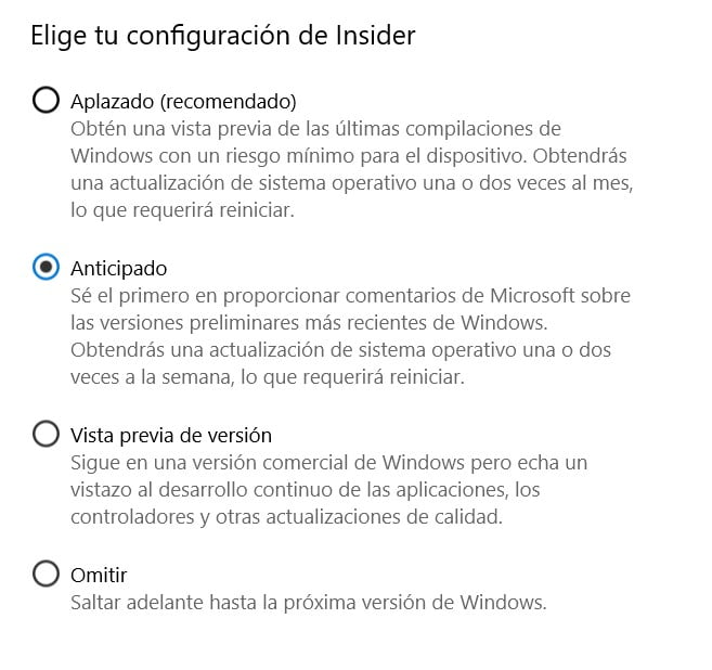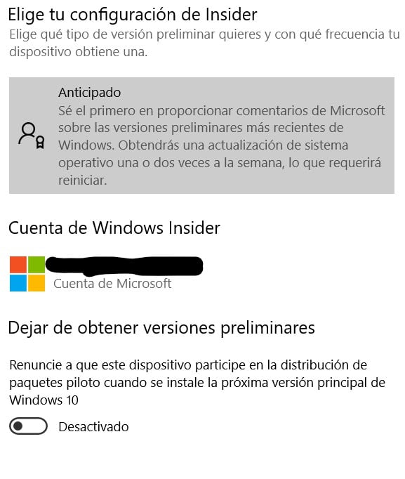 En el programa Insider ahora se nos muestran tres cosas: en que anillo estamos, nuestra cuenta de Microsoft y una opción para abandonar el programa. Además ahora cambiar de anillo es más fácil que nunca, si hacemos click en el anillo actual se nos abre un menú donde podemos leer en que consiste cada uno y con un click podemos cambiarlo.