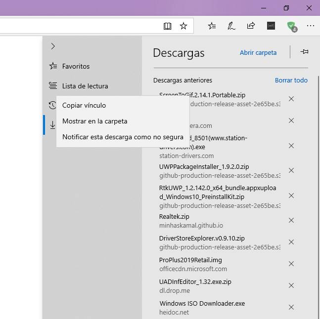 La Jump List adquiere algo más de protagonismo al mostrar los sitios que hemos visitados recientemente. También, tendremos la opción de ver los archivos descargados en la carpeta en la que los hayamos guardado o copiar el enlace de la fuente desde el menú contextual en el hub de descargas.