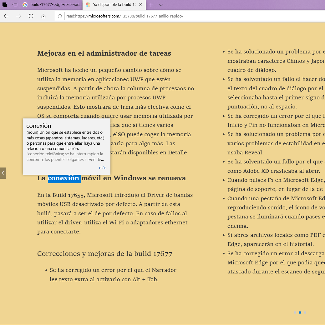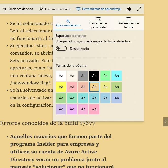 El modo de lectura sigue evolucionando con esta actualización y es que, en esta ocasión, recibe nuevos temas que nos facilitarán su uso. Esto, junto con el foco de línea, que nos permite mantener la concentración en lo que estamos leyendo y la muestra de definiciones al marcar una palabra, terminan de completar un trabajo que comenzó con April 2018 Update.
