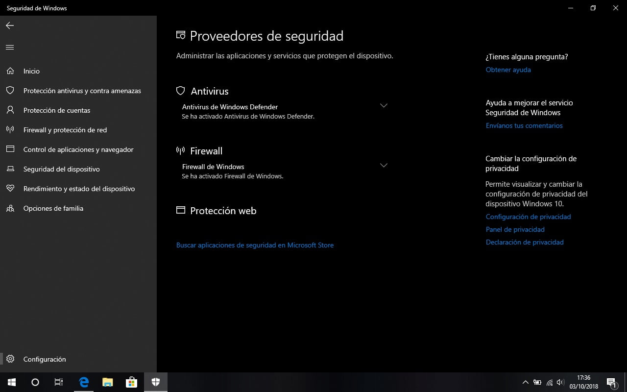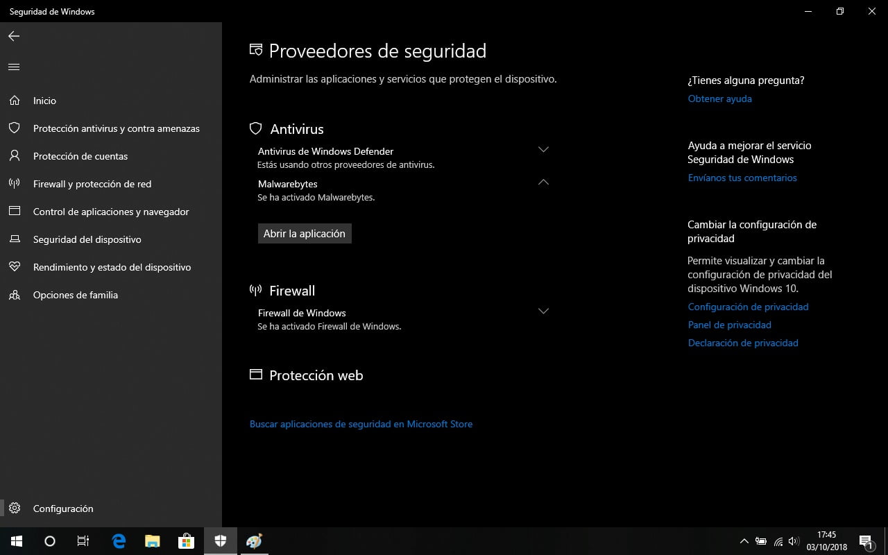 Desde Microsoft, han añadido una nueva página llamada Proveedores de seguridad, la podemos encontrar en la configuración de la aplicación. Desde ese panel podremos ver una lista de todos los proveedores de seguridad que tengamos instalados, incluyendo antivirus, protección web y firewall. Además, un gran añadido es que podremos obtener información sobre cualquier problema que se nos haya notificado a través de la aplicación de Seguridad de Windows.