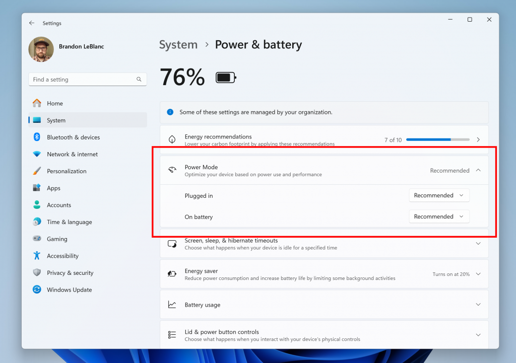 - Se están empezando a implementar mejoras en Ajustes > Sistema > Energía y batería, incluyendo la posibilidad de configurar el modo de energía tanto cuando el PC está enchufado como cuando está en batería, junto con algunas otras mejoras en la interfaz de usuario de la página.