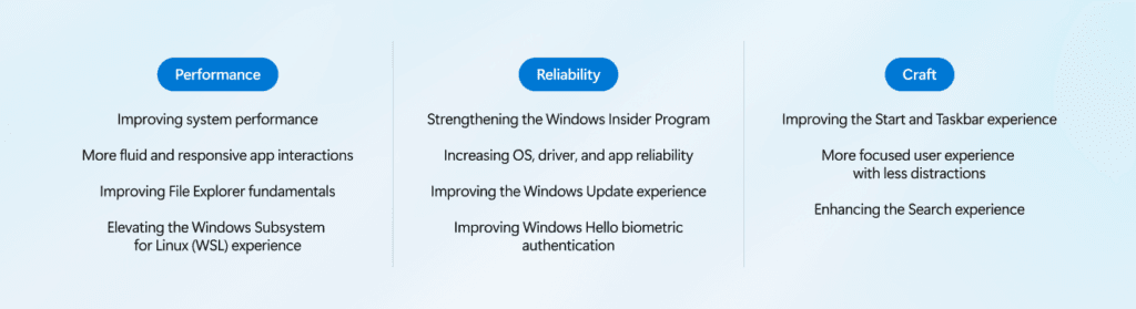 Microsoft agrupa buena parte de su hoja de ruta bajo el bloque de Performance. Ahí promete: